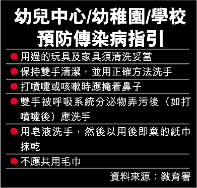【本報訊】教育統籌局及衞生署昨日向全港學校發出通告,呼籲各幼兒中心、幼稚園及中、小學的教職員作好預防,並提醒學童和家長加以注意傳染病的影響。