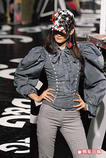 這個明顯懷八十年代舊的作品,強烈對比的色彩無處不在,tobeseen的partygirl,一時身穿全套黑色pantsuits卻襯一對shockingcolour的尖頭高跟鞋,過一刻又可以換上一件frillyblouse襯窄長褲打扮,再興之所致,索性以一身PVCtubetop迷你裙,腳上是印滿圖案的絲襪,或戴上塑膠青蛙或海豚的巨型頸飾,再加一件強調肩部線條的bigshoulderblouse或jacket,誇張、好玩,心照不宣。