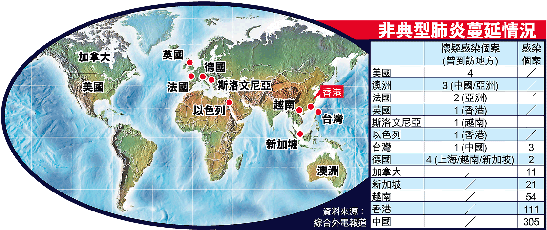 兩名從香港分別返回英國及以色列的人士都出現病徵;其他歐洲國家包括法國、德國、斯洛文尼亞,均有從亞洲歸國的旅客懷疑染病;澳洲三人疑染病;新西蘭航空公司昨在威靈頓降落的客機上,懷疑有兩名乘客染上非典型肺炎,機上約七十名乘客暫被隔離。