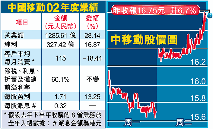 【本報訊】中國移動(941)昨日宣布2002年度業績,純利327.42億元人民幣,增長16.87%,為市場預測中位數,首度派息0.32元,按純利計,派息比率為20%。