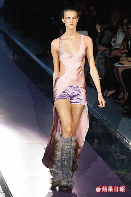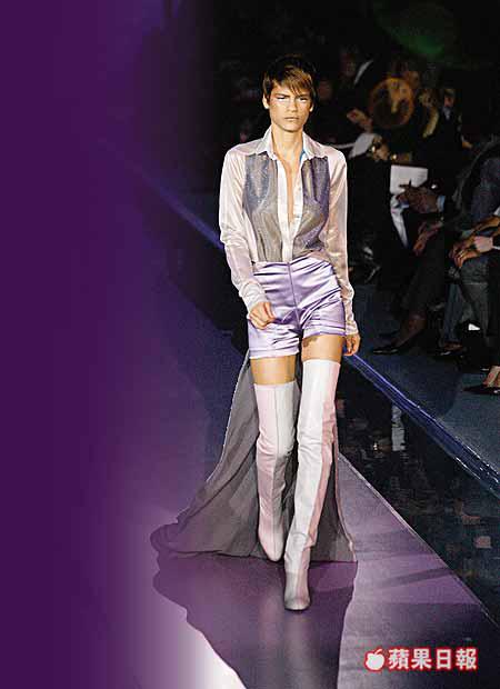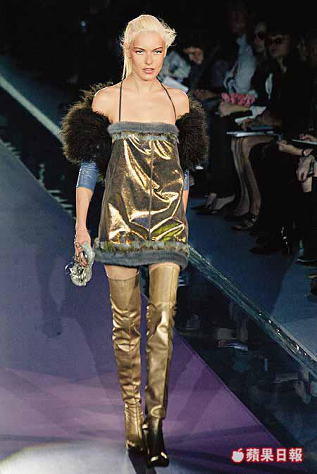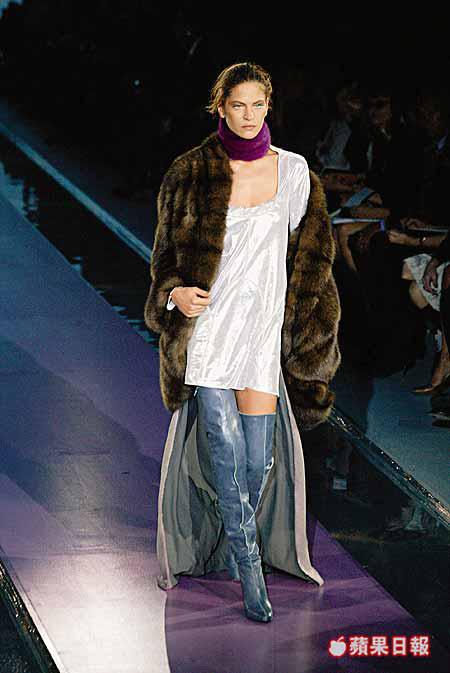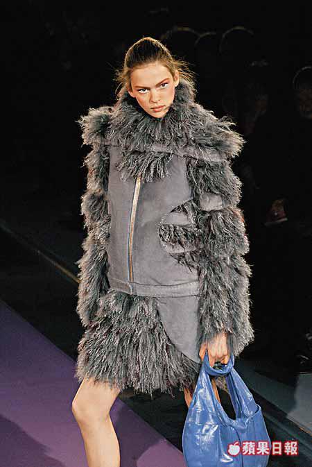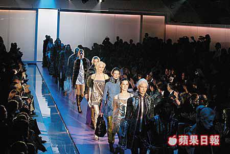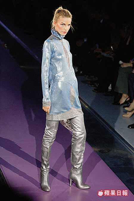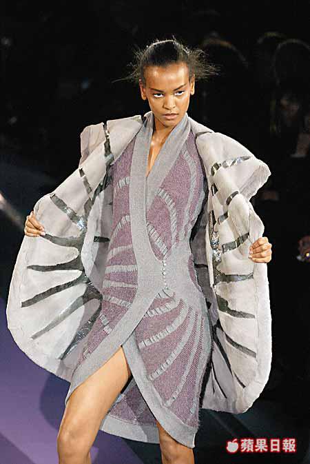 新裝大玩fabricsmixture,最昂貴的皮毛如紫貂、fox、sheermink做成的短身jacket,外綴星際感覺的塑膠素材,再襯以武士款的satinpants,又或是珠片裙,腳踏一雙超長皮靴,硬朗、摩登又充滿最fancy的年輕色彩,整個collection在銀光與粉色籠罩下,顯得輕快怡人,毫不heavy,那份像從galaxy降下的太空感覺,真可暫時驅走心中的陰霾,沉醉於沒戰爭的遙遠星際。