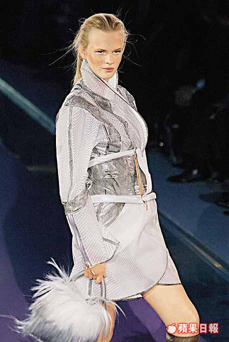 古羅馬武士服的元素,KarlLagerfeld在今個春夏Fendicollection已先作着墨,但那是個充滿女人味的collection。風景一轉,在秋冬Fendicollection上,武士盔甲式的裝飾元素仍然保留,但卻滲入可以很少女味道的spaceage風情。