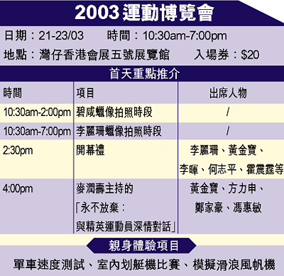 想不想近距離一睹香港「風之后」李麗珊或者「單車王子」黃金寶的廬山真貌?或者與英格蘭足球明星碧咸蠟像拍照留念?今日起一連三天在香港會展舉行的「運動博覽會2003」將可一償以上的心願。