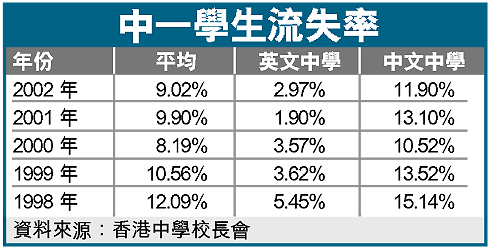 香港中學校長會去年十一月向全港中學發出問卷,收回一百四十六份,結果發現,去年七月經教育署派位的二萬七千名中一學生中,到入學前共有二千四百多人未有報到或因其他理由離開原本派往的學校,平均流失率為百分之九點零二,個別學校的流失率高達七成,而中文中學的流失率為一成二,遠高於英文中學的百分之三。