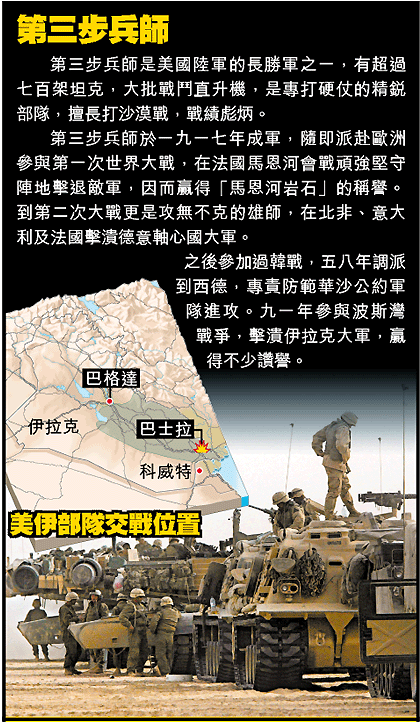 在地面戰爆發前幾小時,即香港時間昨晚九時半左右,美英聯軍即傳出猛轟炸巴士拉消息,轟炸行動幾小時未停,很可能正是為地面戰清除路障。這次轟炸行動,是在美國對伊開戰首天,美軍在香港時間昨早十時三十五分起的一個半小時內向伊首都巴格達發動三輪空襲、後來伊北戰略和石油重鎮摩蘇爾亦響起防空警報後的另一場空襲。