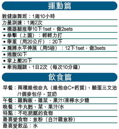 Utah:定時運動、飲食要健康。像我,我天生不食肥膩食物,不食雞皮。運動嘛,是父母由細培養出來的。我細細個就踩單車、打羽毛球、行山,那時候已經覺得做運動好開心。只是後來長大後只顧跳舞,直至五年前才再做運動。