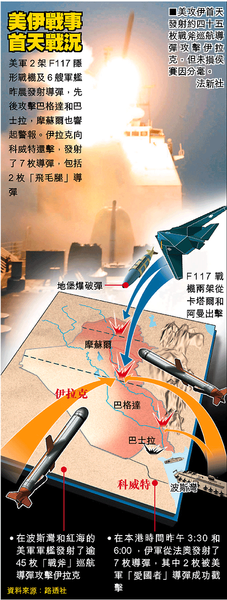 第二次波斯灣戰爭於香港時間昨早十時三十五分響起第一炮,代號「伊拉克自由」(IraqFreedom)行動。在開戰第一天,美軍單方面發動「斬頭式」攻擊行動,火頭對準伊拉克總統薩達姆.侯賽因,發射約四十五枚「戰斧」巡航導彈和投下地堡爆破彈,卻都炸不死他。侯賽因反而亮相國營電視台促伊拉克人「拔劍」與敵軍作戰,接着伊軍更對準在科威特的美軍軍營發射「飛毛腿」導彈還擊。有俄羅斯評論家就指美軍在開戰首天已經失敗。