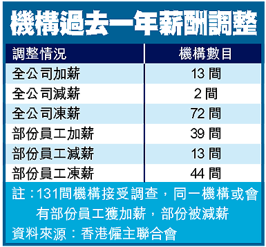 綜合全部受調查機構的薪酬情況,平均有零點零九的薪酬升幅,過去一年凍薪的機構仍佔大多數,同時有約八十間機構減少人手。
