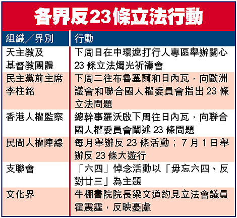 【本報訊】立法會《國家安全(立法條文)條例草案》委員會將在下周二及周四開會,審議《基本法》二十三條法例。為阻止惡法通過,基督教和天主教團體將舉辦反二十三條燭光祈禱會;民主黨前主席李柱銘會聯同香港人權監察總幹事羅沃啟,下周飛往歐洲,向歐洲議會和聯合國展開第二輪外訪游說活動;民間人權陣線則計劃在七月一日舉行萬人大遊行,凝聚反對聲音。
