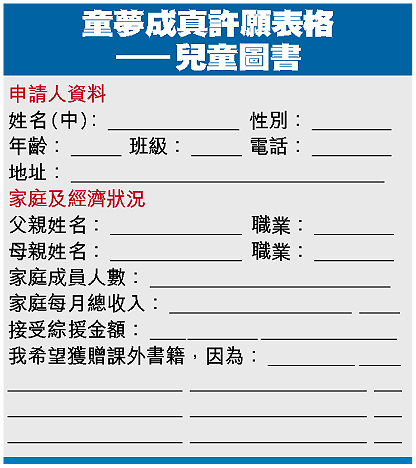 若你家孩子盼有課外圖書閱讀,請填妥「童夢成真」許願表格,傳真或寄交:將軍澳工業邨西駿盈街八號蘋果日報慈善基金收,信封面註明「蘋果基金童夢成真行動」,待基金審核符合資格後,將盡力助孩子達成心願。