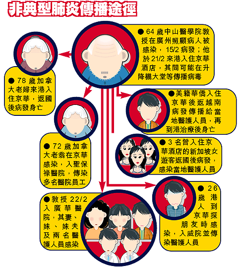 【本報訊】追查非典型肺炎病源的衞生署專家一直沒有想過,奪命肺炎擴散至本港各區醫院和全球多個地方,旺角京華國際酒店竟是當中關鍵。至三日前,新加坡和加拿大的衞生部門傳來資料,赫然發現兩地的肺炎病患,均不約而同入住過該酒店的九樓,再經翻查在廣華醫院病逝的廣州醫科教授資料,奪命肺炎的傳播途徑終於揭開。 記者:陳沛敏、梁瑞帆