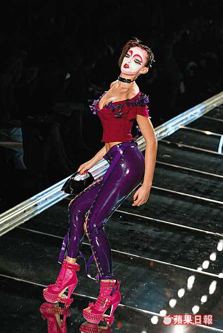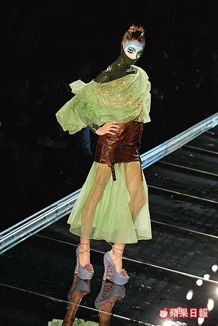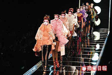 今次新作集幾季HauteCouture或readytowear之大成,有sculptured味道濃厚的jacket、上衣、一件件綴滿ruffles的chiffonblouse,兩邊是巨大無比的satin燈籠袖,下身則是slimcut的魚尾裙或是不能再窄的rubberpants,整個外形結構是上重下輕,玩得既risky卻又精采,清晰為傳統的貼身biascut設計賦上新面貌。