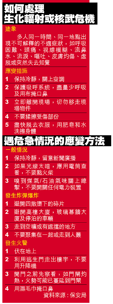 這本名為《香港安居樂土──反恐防患,早有準備》的二十頁小冊子,市民可於各區民政事務處索取,或在保安局網頁上瀏覽。指引列出市民一旦遇到各種突發事件,例如炸彈爆炸、火警及生化襲擊時的應變方法(見右表)。例如:發現不明郵包或郵包有電線、金屬片外露應懷疑為郵包炸彈。