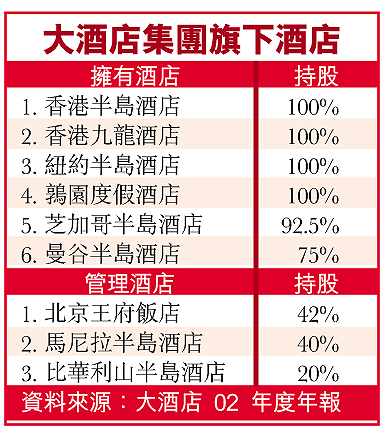 現時除了香港的半島酒店及九龍酒店外,大酒店分別於北京、曼谷、馬尼拉,及美國的紐約、芝加哥、比華利山及加州擁有酒店(見表)。此外,大酒店亦落實在東京丸之內商業區興建東京半島,預期可於07年營業,但具體投資額仍未公布。