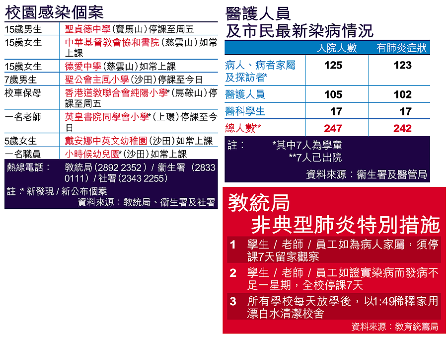 另外,政府昨公布非典型肺炎病者家屬中有一百八十多名學生(未計算大專學生),教育統籌局宣布採取緊急措施,包括學校一旦發現有學生或教職員受感染,即時全校停課七天。 記者:譚秀嫺、陳倩雯