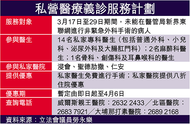 是次私營醫療義診服務計劃,由身兼香港醫學會會長的醫學界立法會議員勞永樂發動,暫定為期兩周,目的是為受到威院事件影響而未能如期在本月十七至二十九日期間進行非緊急外科手術的病人,提供一個進行手術的選擇,以減輕醫管局新界東聯網醫院醫護人員的壓力。