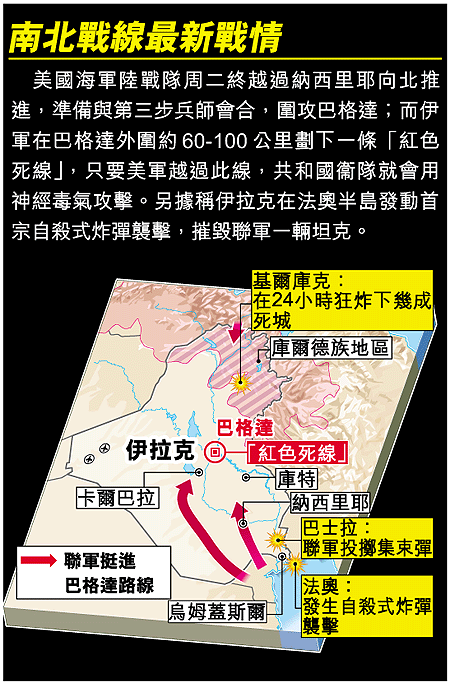 美軍王牌部隊第三步兵師、第七騎兵師、八十二及一○一空降師、海軍陸戰隊直撲巴格達,先頭部隊到香港時間今日凌晨距離巴格達只有八十公里!這場由六萬美英聯軍對六萬共和國衞隊的決戰序幕戰已拉開,美軍周一出動攻擊直升機猛轟共和國衞隊,冀圖掃清障礙。面對大軍壓境,侯賽因已在巴格達周圍劃定界線,授權共和國衞隊用化學武器迎戰越界的聯軍。