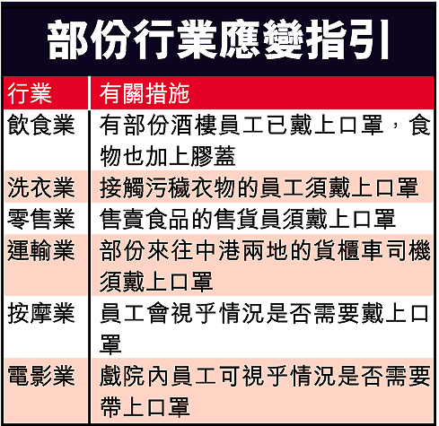 香港洗衣商會副主席李希文說,考慮到從業員接觸到污穢衣物,不少員工近日已戴上口罩工作;新浪潮海鮮酒家董事總經理羅偉光稱,負責煮熱食物攤位的員工,由於有機會與食客對話,故已戴上口罩。