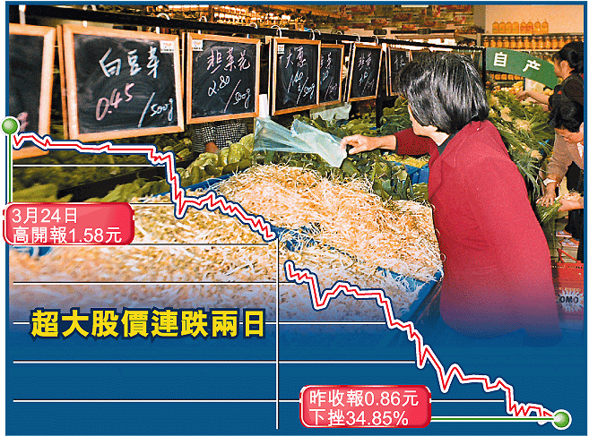 超大主席郭浩及財務總監陳志寶昨日在記者上,將毛利率及盈利下跌,歸究於冬天天氣影響蔬菜採收、超市業務低毛利拖低了整體毛利率,及中國批發蔬菜市場02年整體市價下跌一成所致。期內,超大批發業務佔總營業額比重,由去年同期53%增至62%;每畝農地收益率下跌至2.85%;每公斤蔬果售價跌5%,至2.27元人民幣,蔬果採收率亦跌5.3%,至1.44%。該公司未有提供5間超市去年營業額。