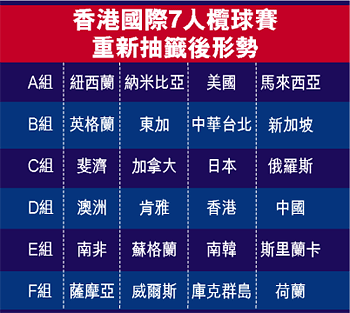 【本報訊】因香港出現非典型肺炎而有三外隊退出今屆香港國際七人欖球賽,賽會被迫補選實力較弱的荷蘭、納米比亞和東加代替,並在昨日重新抽籤分組。