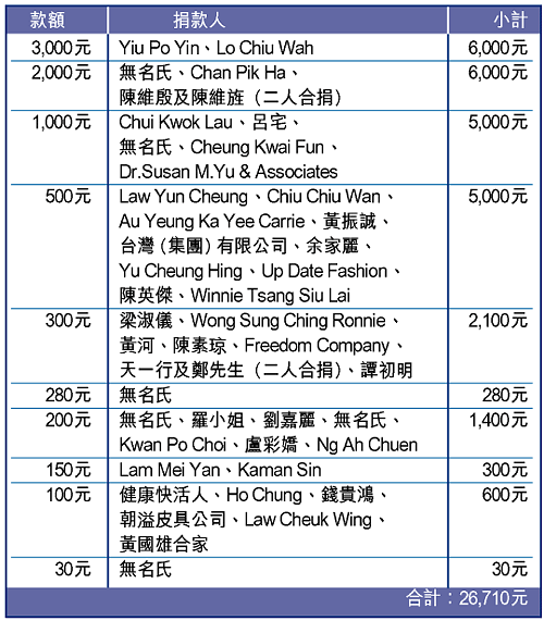 黃先生的四歲女兒月前不幸因血癌病逝,他與妻子痛入心脾之餘,亦因為失業,無力殮葬愛女。蘋果基金曾撥款二萬元予以應急,及後再將一筆讀者捐款合共二萬六千七百一十元轉交黃先生。 對於善長的慷慨幫忙,黃先生深表感激,他又表示近日已找到工作,將與妻子及兩名兒子好好活下去。 捐款編號:C0712 暖流熱線 電話:29908688 傳真:23702192 電郵:[email protected] 網址: http://www.charity.atnext.com