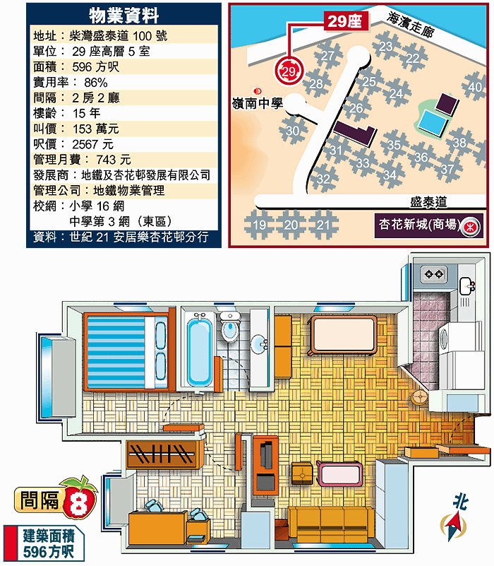 柴灣杏花邨單位最細500餘方呎,樓價約150萬元,是該屋苑上車之選,間隔上主要分長廳及曲尺廳兩類,前者有玄關走廊。今次介紹單位位置接近海濱走廊,雖然座向看不到海景,但環境較清靜,間隔上略作改動後更見使。