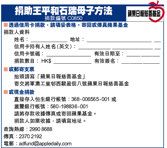 自本報報道王平母子缺錢治病後,接獲讀者捐款逾二十三萬元。