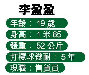 樣子甜美,外形嬌滴滴,談吐斯文的「盈盈」說:「經過連串又要跑又撞嘅地獄式嘅訓練後,令到胃口好了很多;配合訓練令到自己成身肌肉,覺得強壯咗好多,更享受同一大班人一齊訓練同比賽嘅感覺。而平時郁動慣,做少日運動都唔自然,有時間就會落街跑步或者游水。」