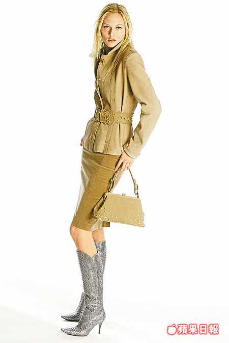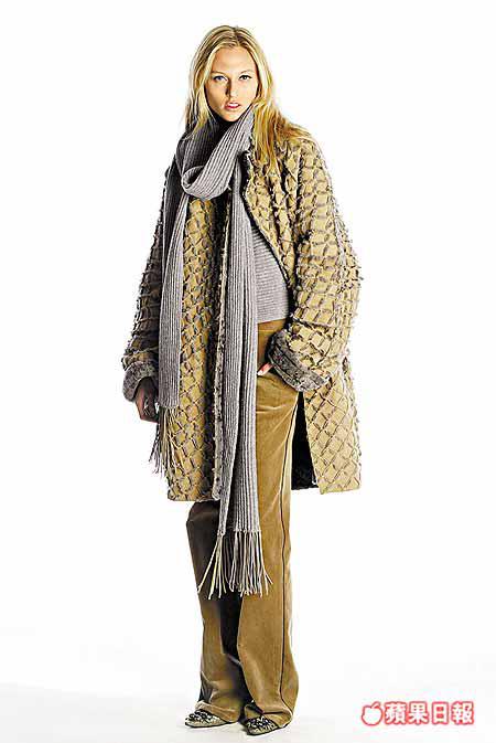 二○○三秋冬BottegaVeneta新作,fabrics儼然成為備受注目的焦點多於設計模式。設計師TomasMaier今次為摩登又實在的BV女郎,塑造出一個以中世紀武士為靈感泉源的形象,服裝、手袋與鞋履的用料縱橫交替地出現,有leather、suede、satin、cashmere、croco及fur,金銀色的buckledetails隨處可見,活脫脫是一個蛻變了的現代武士模樣。