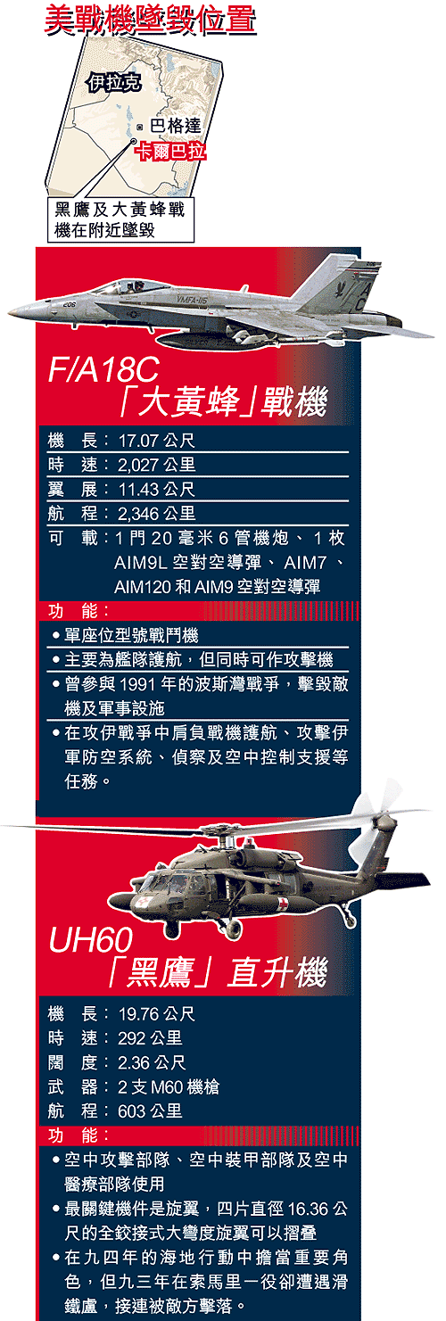 一架美軍「黑鷹」直升機周三晚於巴格達南面激戰區卡爾巴拉(Karbala)附近墜毀,美軍七死四傷;數小時後再有一架美軍F/A18C「大黃蜂」戰機墜毀,軍方正全力搜尋生死未卜的機師,並正調查該戰機是否由美軍的「愛國者」導彈擊落。