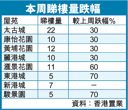 【本報訊】香港置業表示,本周屋苑睇樓量暫全面報跌,跌幅最大為沙田駿景園及將軍澳東港城,均達七成。相信要待非典型肺炎獲得控制,市民恢復信心,睇樓量才可望回升。