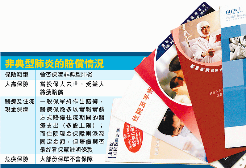 保栢、美國萬通、宏利人壽等保險公司均表明,已購買醫療保險或住院保障的客戶,若然感染到非典型肺炎入院,將可以得到賠償。美國萬通保險市務部高級副總裁蕭莉玲表示:「通常醫療和住院現金保障計劃的不保事項,包括先天性疾病、定期檢查和整容外科手術等,但最好是投保前先看清楚保單條款。」