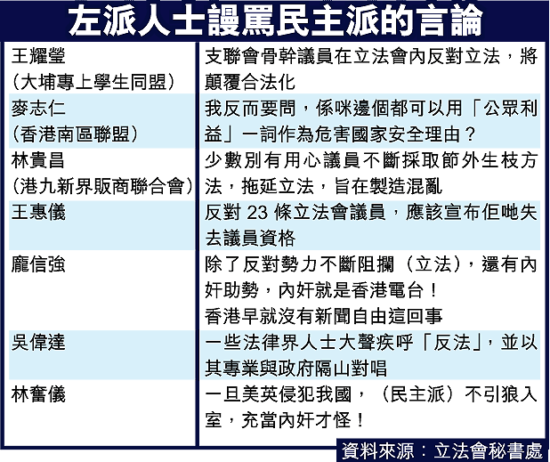 香港衞生護理專業人員協會代表蔡錫聰直指政府將法例修訂得太寬鬆,應該更加嚴格。大埔專上學生同盟的王耀瑩直指包括支聯會在內的民主派議員反對立法,不但「將顛覆合法化」,更企圖以「一國兩制去打倒一國兩制」。另一位學生代表王惠儀更指民主黨議員曾宣誓遵守《基本法》,應該「宣布佢哋失去議員資格」。獨立人士林奮儀,更不點名批民主黨前主席李柱銘為美國誤炸南斯拉夫大使館辯護:「如此無恥民主派政客,一旦美英侵犯我國,不引狼入室,充當內奸才怪!」