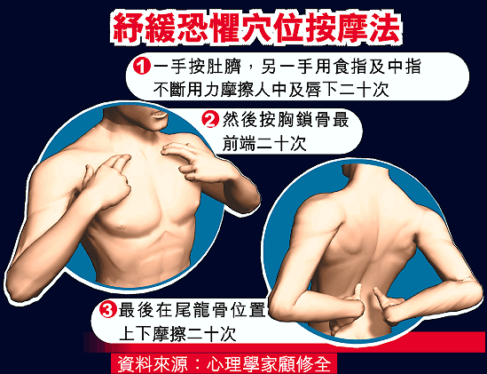 他特別介紹一種可改善恐懼及腎上腺素的穴位按摩法,做法是一手按肚臍,另一手用食指及中指不斷用力摩擦人中及唇下二十次;然後按胸鎖骨最前端二十次;最後再在尾龍骨位置上下摩擦二十次,若果經常做這個按摩,將有助紓緩恐懼。