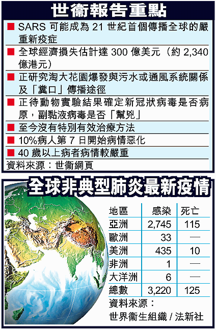「沙士」(嚴重急性呼吸系統綜合症SARS)爆發剛逾一個月,仍未知何時受控。世界衞生組織形容,這可能是二十一世紀首個威脅全球的嚴重新疫症,若疫潮持續蔓延,全球經濟損失估計達三百億美元(約二千三百多億港元)。但世衞樂觀相信,疫情已達高峯期,本港等地對付非典型肺炎的努力將取得成果。 記者:陳沛敏