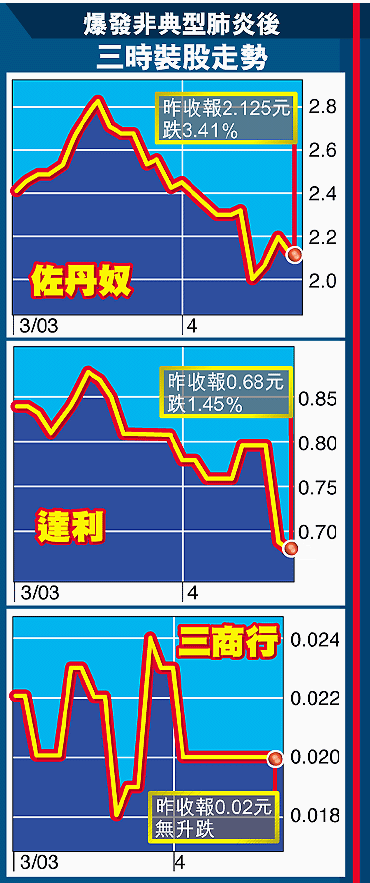 佐丹奴主席助理羅翠妍接受本報訪問時表示,非典型肺炎對該集團的業務構成嚴重影響,以本港市場為例,3月初已「好靜」,但當非典型肺炎在3月下旬擴散至社區後,市民減少出外及旅客取消來港,連僅有的人流也沒有了,結果令上月本港營業額較02年同期下跌了近30%。