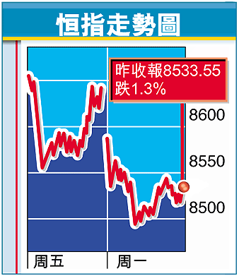 航空股以外,與本港經濟息息相關的銀行及地產股同樣下跌,恒生(011)收報75.5元,跌3.2%;滙豐控股(005)收報82.5元,跌0.6%。所羅門美邦最近調低滙控盈利預測後,昨日再將其12個月目標價由95元降至81元,投資評級是「與大市同步」。