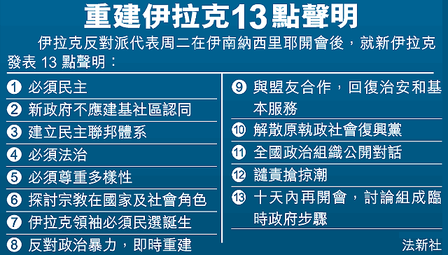 美國號召和主導下,伊拉克反對派代表周二伊南城鎮納西里耶開會,討論國家未來,發表十三點聲明打造民主伊拉克。美軍中央司令部司令法蘭克斯已到巴格達檢視情況,但重建伊拉克困難重重。