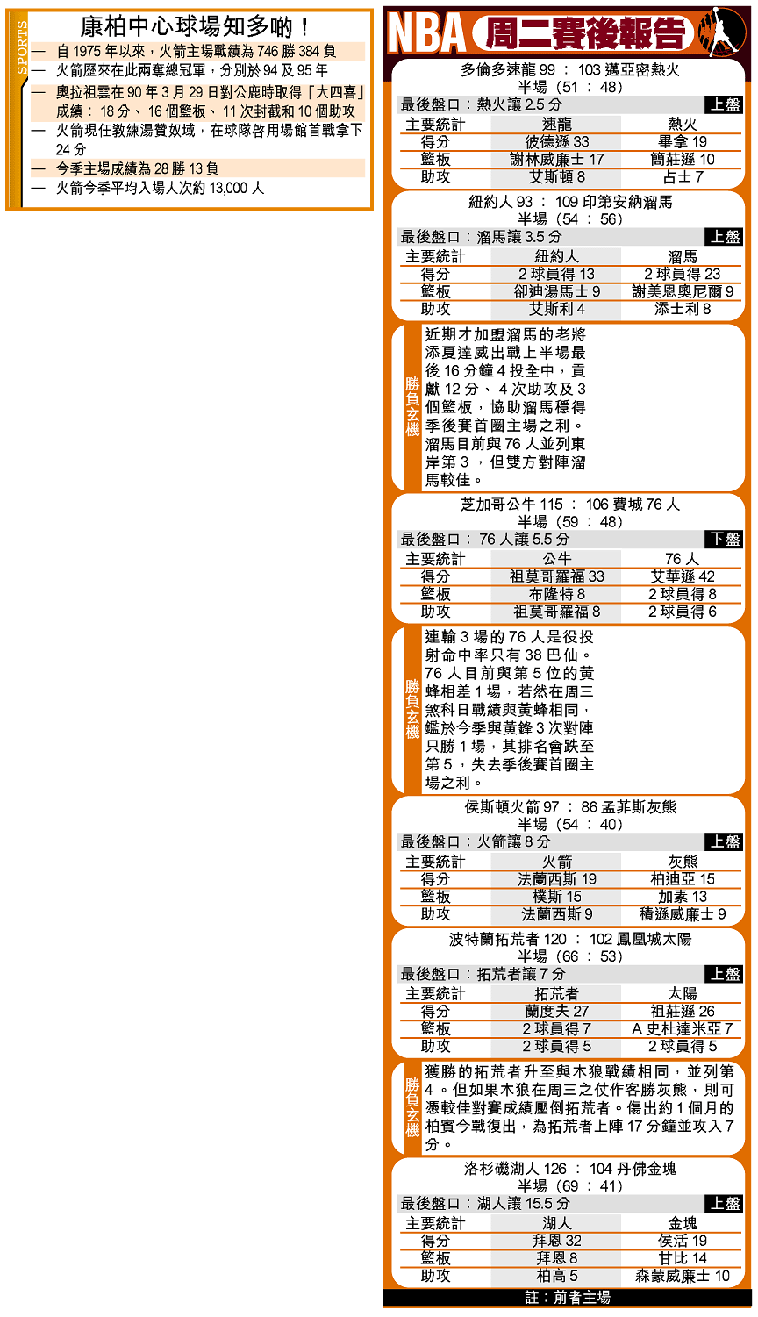早前已向季後賽說再見的侯斯頓火箭,周二在今季最後一場主場賽事以九十七比八十六輕取孟菲斯灰熊,向球會經歷了二十八個賽季的主場館康柏中心球場道別。令以勝利作開始的康柏中心球場,亦以勝利畫上一個圓滿句號。火箭來季將搬入位於侯斯頓市中心、投資達二億二百萬美元的新場館。