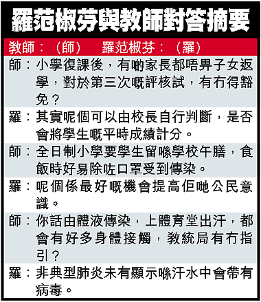 區內二百多名中、小學及幼稚園校長表達了對復課安排的疑慮。但羅范椒芬只重申:「如果發現學生超出正常體溫,有任何唔舒服,就要勸籲家長畀佢哋留係屋企。」