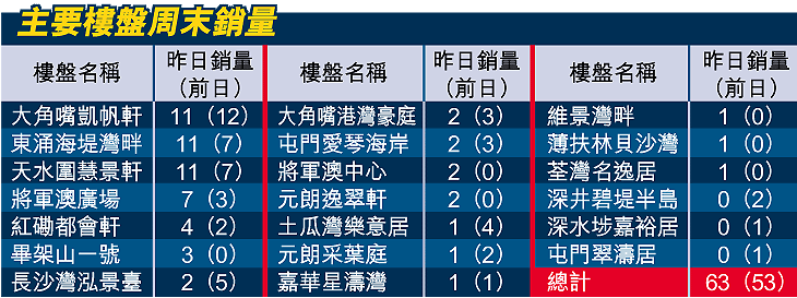 【本報訊】儘管昨日為政府發動的全民清潔保健日,仍有不少市民趁周末假期外出睇樓。復活節假期第二天,市場錄得主要貨尾盤63宗成交,較首日假期的53宗增加19%。個別樓盤仍以大角嘴凱帆軒銷量佔首位,其次則為東涌海堤灣畔及天水圍慧景軒。業內人士指出,睇樓成為部份市民假期消閒節目,過去兩日多為首度參觀人士,料今明兩天交投量才會出現高峯。