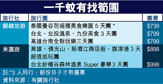 復活節假期後至六月,是傳統的旅遊淡季,關鍵旅遊近日推出多個特價旅行團,吸引市民之餘,也希望重拾市民外遊的信心。其中泰國曼谷、芭堤雅五天團更以七百三十九元作招徠,但必須三人同行;至於近年港人熱門的旅遊點台北及高雄,三天團則只需七百九十九元。