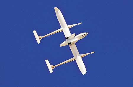 美國飛機設計師魯滕上周五在加州展示他的「太空船一號」(圖1)。這艘可載三人的火箭飛機採用兩段式飛行,先由「白騎士」號噴射機(圖2)載上高空,然後開動引擎飛至離地面一百公里的次軌道太空,兩機合體飛行測驗將於幾周內進行。 美聯社