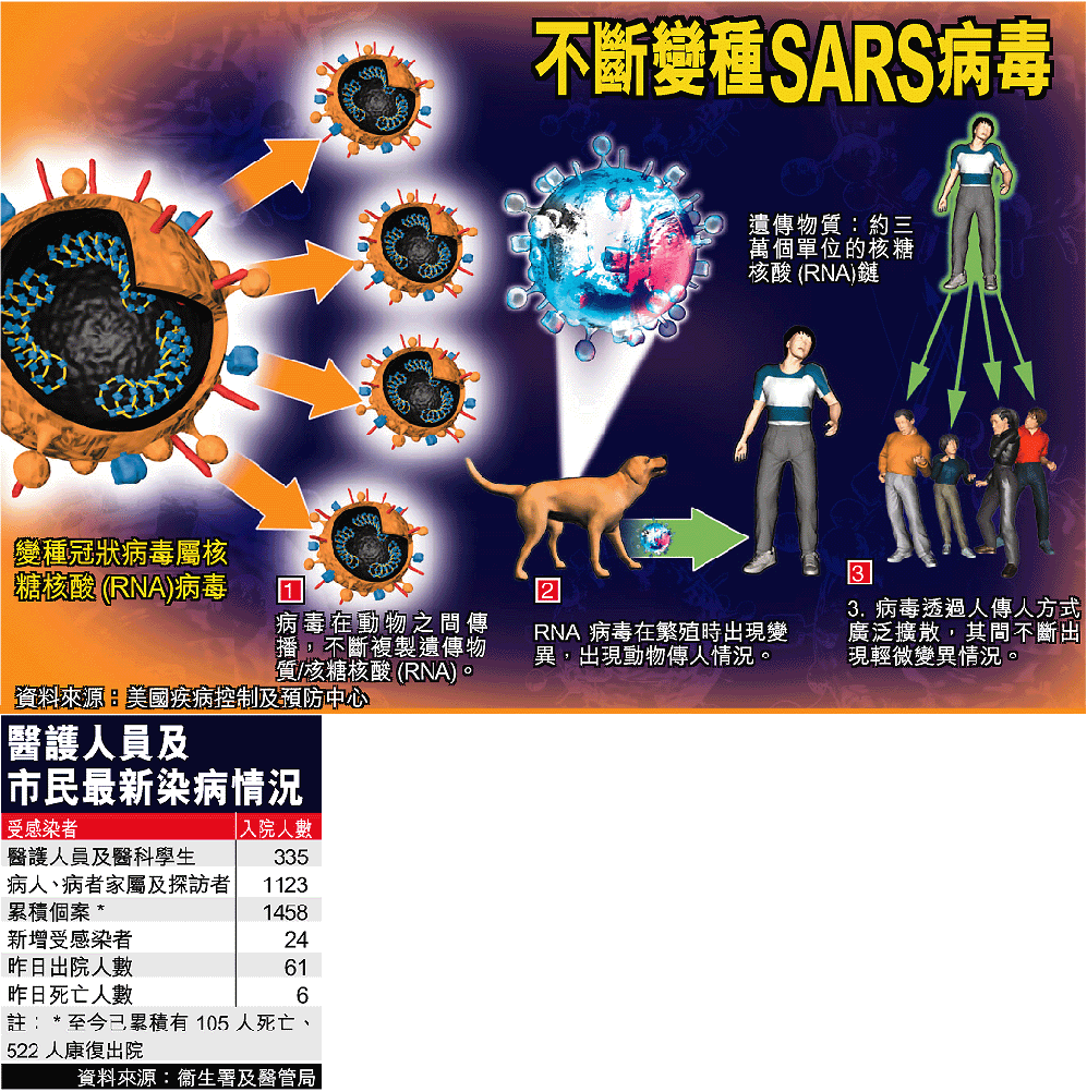 昨日再有二十四人染病,包括四名醫護人員及七名大埔區居民,但就沒有淘大花園的新增染病個案。至今累積染病人數達一千四百五十八人,其中五百二十二人已康復出院;一百三十三人正在療養,準備出院。