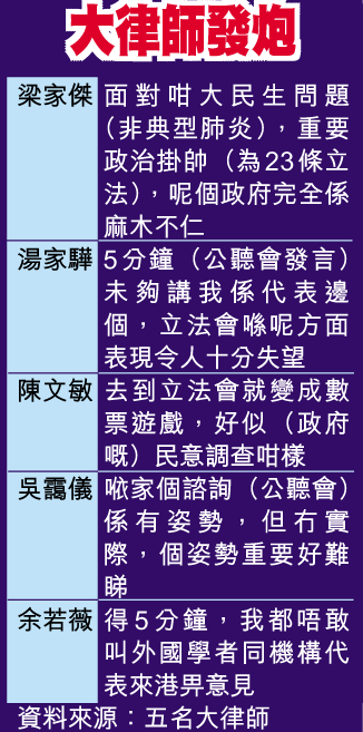 另一位大律師公會前主席湯家驊也承認,在現時情形下,要市民放低非典型肺炎的沉重心情討論二十三條,是十分困難,但立會的做法真的令他十分失望:「立法會議員有重要責任,係認真去討論。五分鐘時間未夠講我係代表邊個,立法會喺呢方面表現令人十分失望。」他說這一切「將來歷史會記載低」。