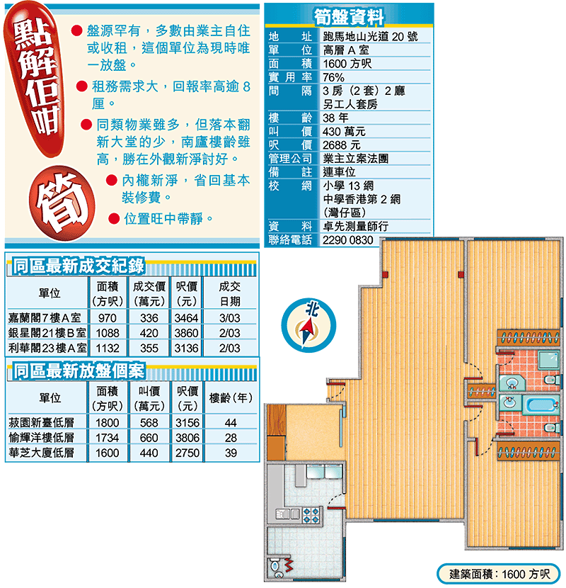 卓先測量師行表示,區內同類高齡樓宇,多數沒有景觀可言,但實用的間隔特質,深受街坊客追捧,過往入市的多數是同區換樓客或長線投資者。若以400餘萬元,欲購區內較新的物業,充其量只可買得起800至1000方呎的單位,但筍盤達1600方呎,起居空間實在無從比較。