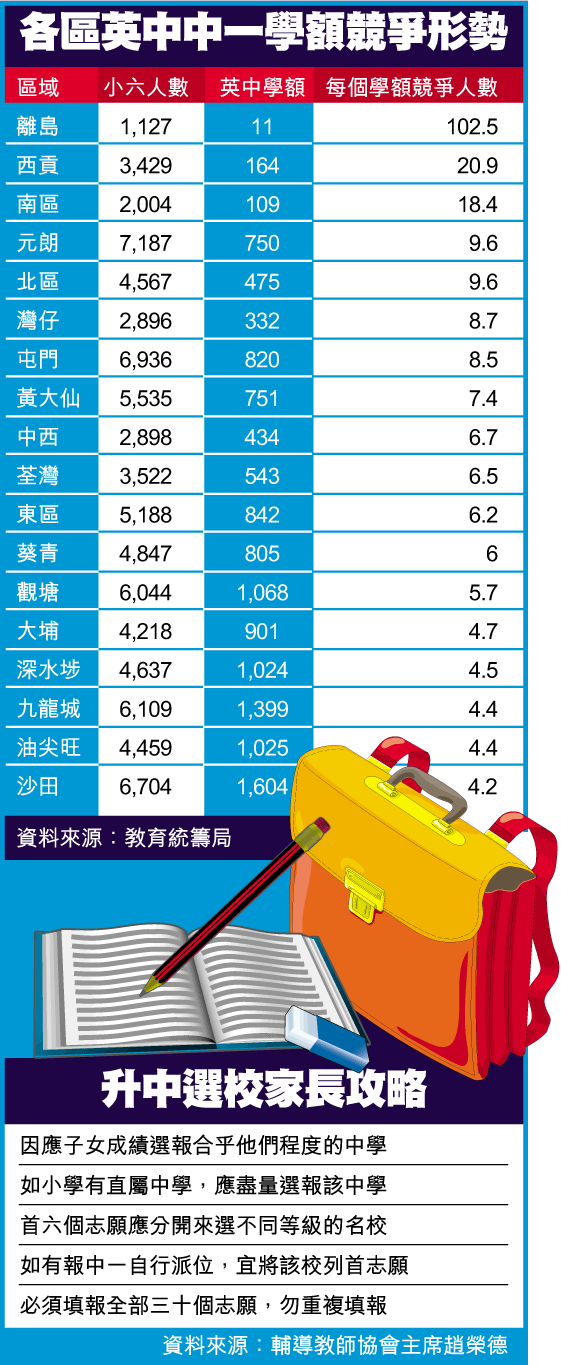 英文中學向來是家長為子女選校必爭之地,據教育統籌局資料顯示,離島區本區校網沒有英文中學,跨區也只有十一個英中學額給離島區學生,平均每一百零二人爭一英中席位,成為全港競爭最烈地區;而只有一間英中的西貢區,也近二十一人爭一英中學額;其他區的英中則介乎四人至十八人爭一位(見表)。