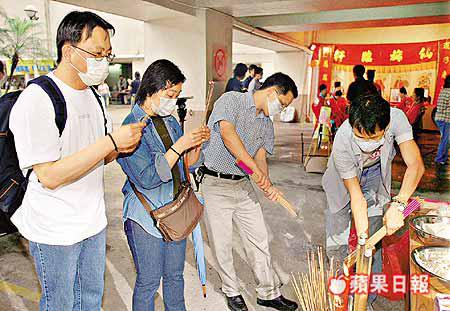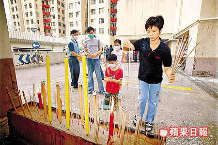 淘大花園業主會昨日舉行法事,超渡淘大花園二十八名非典型肺炎死者亡魂,到來致祭的居民神情哀傷,誠心上香為死者祝福,法事進行期間,不時刮起大風及下着雨,現場一片淒風苦雨,倍覺淒涼。