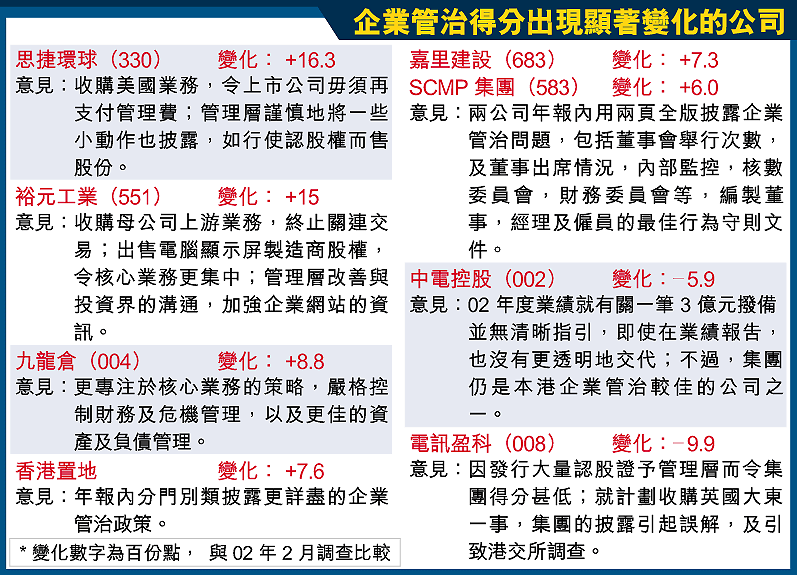 至於表現倒退方面,除了倒退最大的電盈外,中電控股(002)亦下跌5.9個百分點,但仍屬本港最佳的11家公司之一,榜首的滙控得分亦有下跌2.7個百分點。