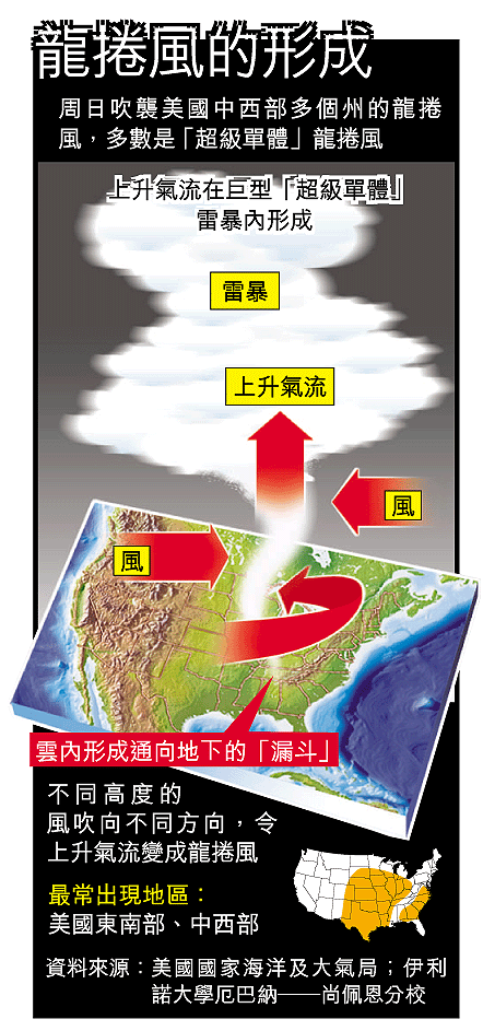 周日吹襲美國中西部的龍捲風,席捲密蘇里、堪薩斯和田納西州,狂風所過處,樹倒屋塌,只見闊達四百公尺的破壞帶。